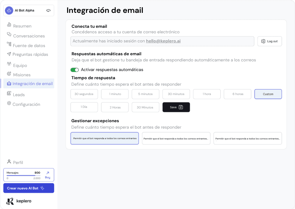 Keplero AI proporciona respuestas automáticas y detalladas, ofreciendo toda la información necesaria de forma inmediata, sin necesidad de intervenciones manuales.
